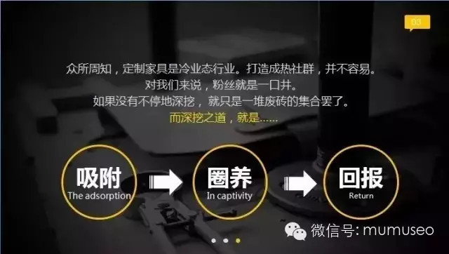 众所周知,定制家具是冷业态行业。打造成热社群,并不容易。对我们来说,粉丝就是一口井。如果没有不停地深挖,就只是一堆废砖的集合罢了。而深挖之道,就是吸附→圈养→回报。