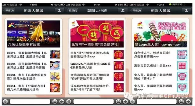 朝阳大悦是北京百货购物中心中最早开通微信的。曾创下10个月内运营微信粉丝14万(超出微博粉丝约1万)、互动率超过40%、微信活动单日回复量超过5000条的成绩……