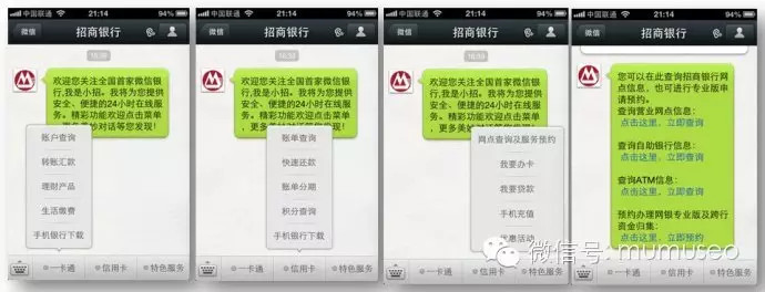 微信现已有苗头成为继中国移动、中国联通、中国电信后的国内第四大运营商,在微信上开设公众账号并且为客户提供服务是众多金融机构必备的。