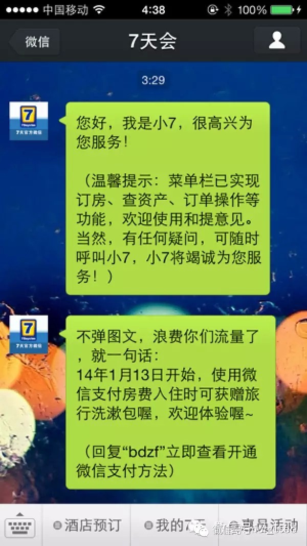 7天连锁酒店的公众号里有一个很奇怪的现象,就是大部分查询结果都是纯文字回复。