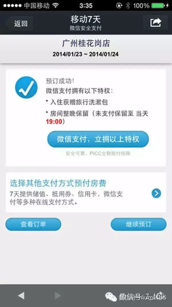 在酒店预定流程上最重要一环就是在线支付,七天连锁酒店在行业内是首家接入微信支付的,客人在微信中搜索酒店,并完成订房、支付,整个购买流程只需要5秒钟,真正打造了一个移动端酒店O2O闭环。