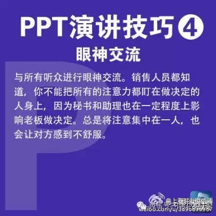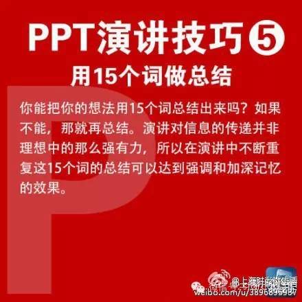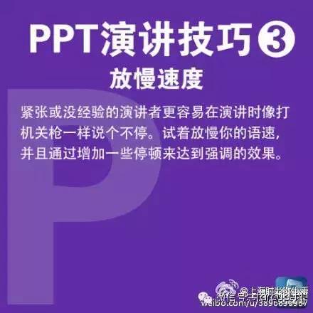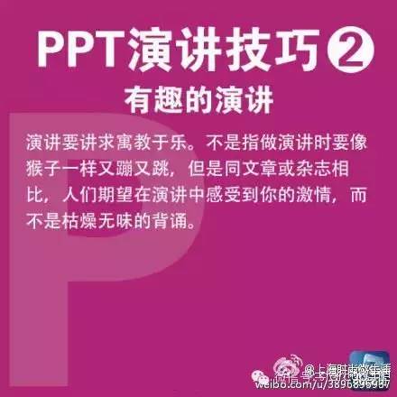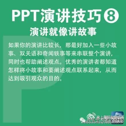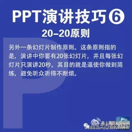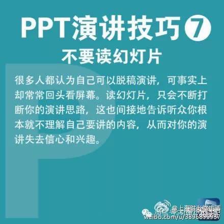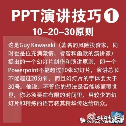 ①10-20-30原则:PPT不超10张,演讲不超20分钟,字体大于30号 ②有趣些 ③眼神交流 ④ 可加入小故事⑤放慢速度⑥20-20原则:20张幻灯片,每张讲20秒 ⑦不要读幻灯片 ⑧15个词总结想法 ⑨从听众角度出发。