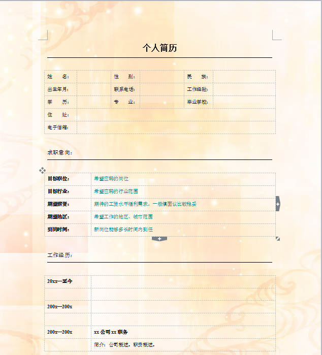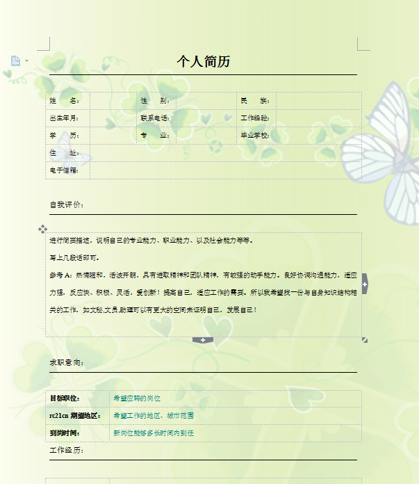 简历是求职者给招聘单位发的一份简要介绍。包含自己的基本信息、求职愿望、对这份工作的简要理解等。现在一般找工作都是在通过网络来找,因此一份良好的个人简历对于获得面试机会至关重要。